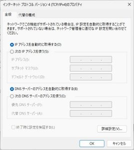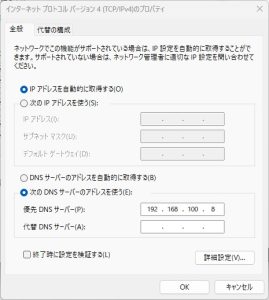 トラブルが発生したPCはWindowsの設定アプリでネットワークアプリを行っていました。念のためコントロールパネルのネットワークアダプタ設定を確認すると有線アダプタのDNSが「自動」になっていました。