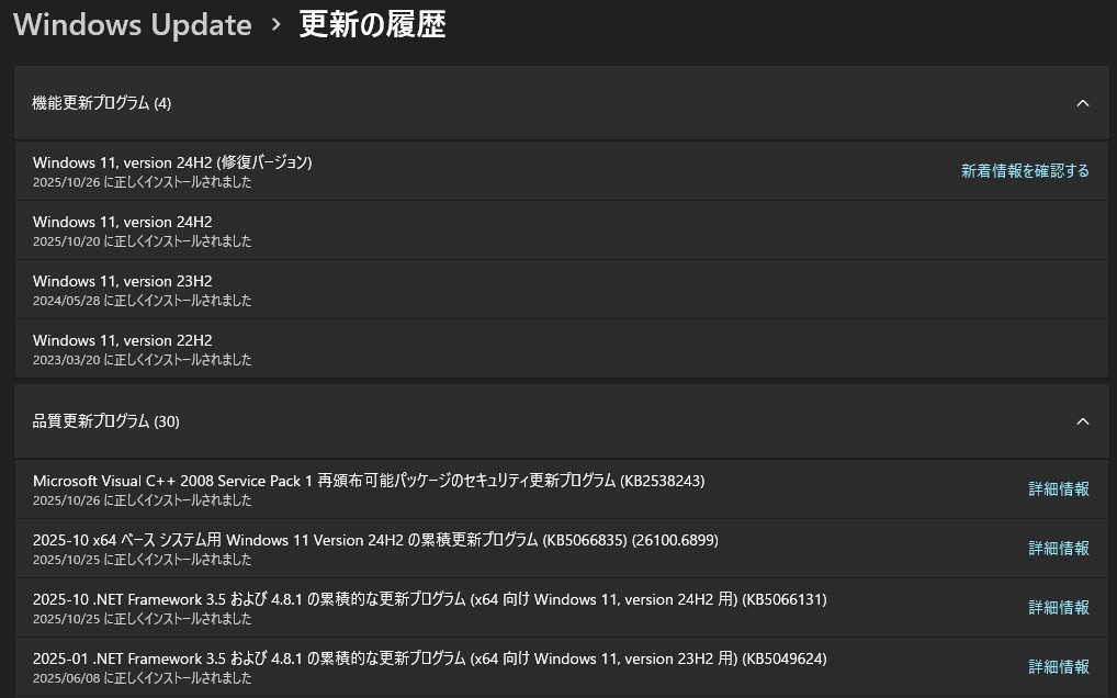 10/20と10/26にインストールされました。修復バージョンとあります。これは別件で10/26に手動で修復作業をした結果です。